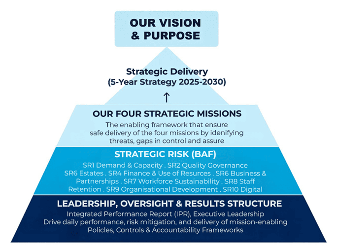 It is also anticipated that the IPR will by then be deconstructed to be aligned to each of the four missions, which will enable the Executive to talk, by mission, to the BAF, IPR and assurance discussions. This aligns with the Trust’s shift toward a more integrated governance model, designed to provide a consistent golden thread between operational performance, strategic risk, mission delivery and Board level assurance, as demonstrated in the graphic below:
